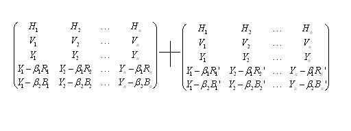而現(xiàn)在的偽立體電視是由行向量H,幀向量V,亮度向量Y組成的三維線性空間。表達(dá)彩色信息的是由紅向量R,R',綠向量G,G',蘭向量B,B'組成的。共有H,V,Y,R,G,B,R',G',B'九個向量,通過不同的線性組合,組成的三維線性空間??捎靡韵伦笥叶€的矩陣來表示: