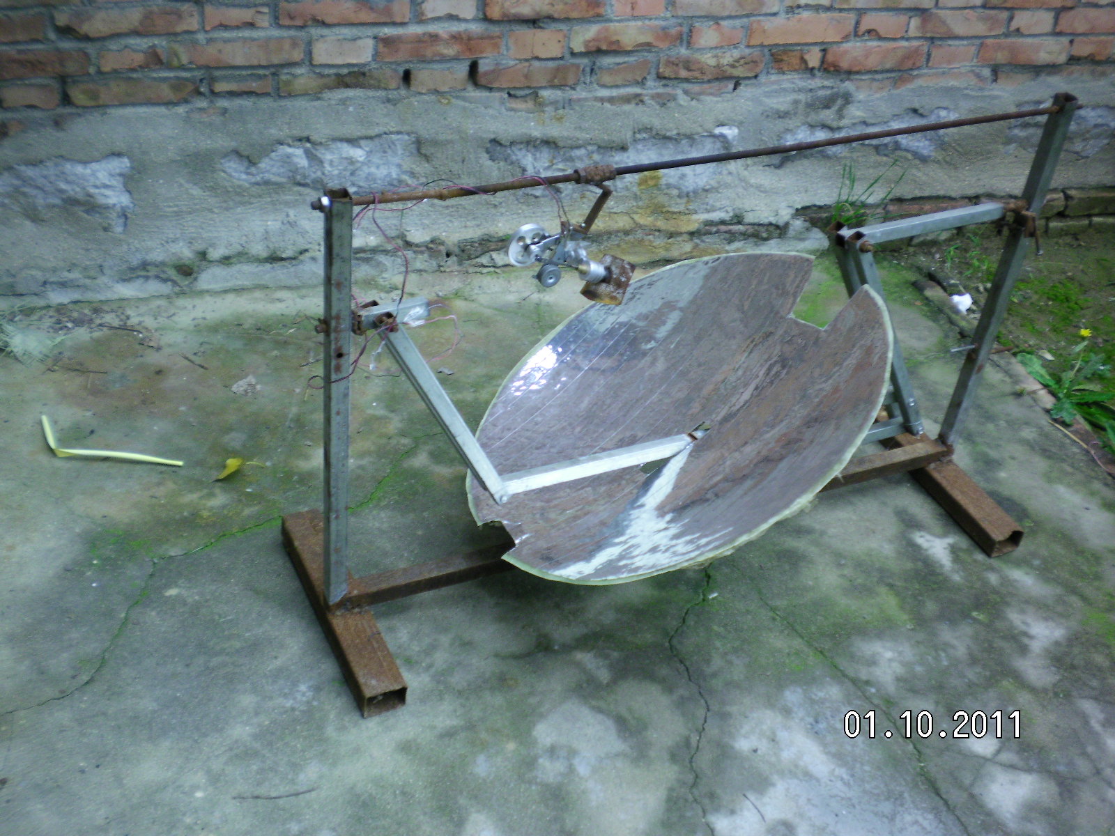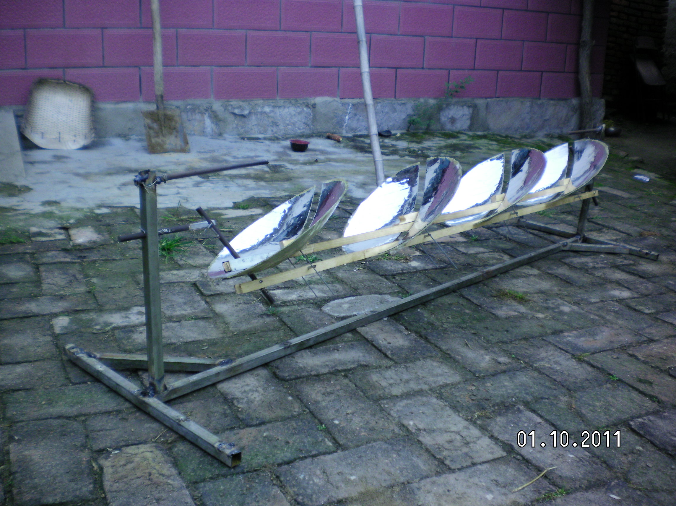 隨著全球環(huán)境惡化和日益嚴(yán)峻的能源形勢世界各國對(duì)太陽能熱發(fā)電越來越重視?,F(xiàn)在最常用的太陽能熱發(fā)電系統(tǒng)主要有槽式、蝶式和塔式,槽式和蝶式的光熱部件必須隨聚光鏡做相應(yīng)的運(yùn)動(dòng),槽式各個(gè)光熱部件復(fù)雜昂貴,蝶式光熱部分只能單獨(dú)使用塔式的受熱部分出現(xiàn)故障很難維修這三種系統(tǒng)都有自己的缺點(diǎn)?;诖宋以O(shè)計(jì)了平行定焦太陽能聚光集熱發(fā)電系統(tǒng):主要有一對(duì)支柱.一對(duì)轉(zhuǎn)軸.一對(duì)動(dòng)臂.旋轉(zhuǎn)拋物面聚光鏡.一根托桿.一根平行桿.平行連桿組成將兩支柱固定在一條直線上,兩轉(zhuǎn)軸安裝在兩支柱上兩轉(zhuǎn)軸可以左右轉(zhuǎn)動(dòng),兩動(dòng)臂安裝在兩轉(zhuǎn)軸上使可以隨轉(zhuǎn)軸左右前后擺動(dòng)。托桿安裝在兩動(dòng)臂上,平行桿與托桿平行安裝在兩動(dòng)臂上,這樣動(dòng)臂.托桿.平行桿構(gòu)成一個(gè)平行凹框。在旋轉(zhuǎn)拋物面鏡原點(diǎn)安一橫軸并切去部分旋轉(zhuǎn)拋物面鏡,在橫軸兩端垂直安裝兩根平行連桿,把旋轉(zhuǎn)拋物面鏡的橫軸安裝在托桿上。在平行桿上安裝連桿軸把平行連桿與連桿軸連接在一起。所述旋轉(zhuǎn)拋物面鏡的焦距等于托桿與轉(zhuǎn)軸之間動(dòng)臂的長度。將動(dòng)臂對(duì)準(zhǔn)太陽陽光就會(huì)聚焦到固定點(diǎn)上在這些位置安裝光熱部件就會(huì)得到熱能用于熱發(fā)電。這種結(jié)構(gòu)是雙軸定焦所以效率很高,抗風(fēng)性好。這種結(jié)構(gòu)可以做成很小裝在高在15-20cm的透明罩內(nèi)安裝在樓頂或樓房南墻上,為人們提供開水或蒸汽。請(qǐng)看模型照片: