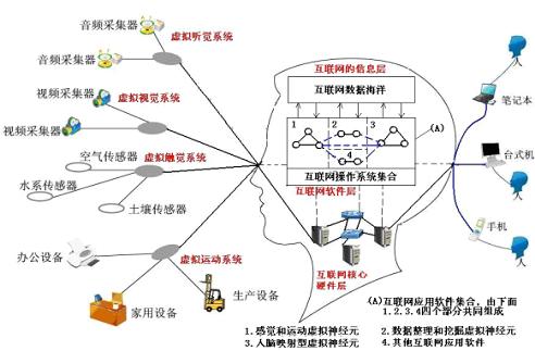Google的街景系統(tǒng),中國水利部的防汛抗旱傳感器網(wǎng)絡(luò),醫(yī)院的遠程手術(shù)讓我們聯(lián)想到生物的視覺,軀體感覺和運動神經(jīng)系統(tǒng)。到2008年我們發(fā)表論文,繪制出這樣一張互聯(lián)網(wǎng)虛擬大腦結(jié)構(gòu)圖。