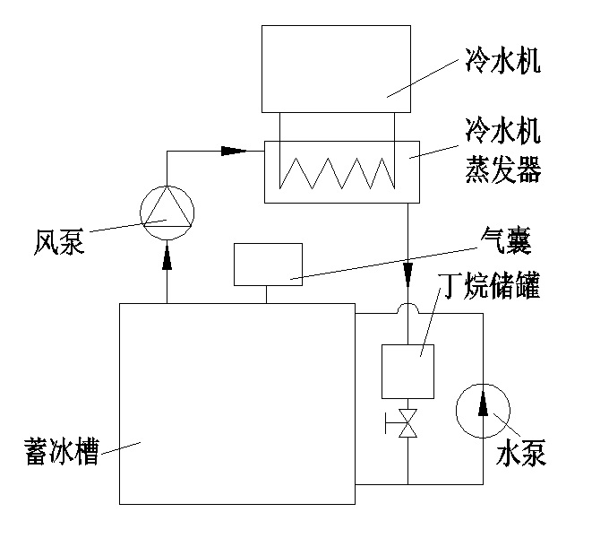 丁烷冰漿采用了簡單高效的理念,采用冷水機組、風泵、水泵等通用高效設(shè)備,流程簡單,控制容易,維護方便,氣態(tài)丁烷通過風泵加壓進入冷水機蒸發(fā)器,通過氣液相變高效換熱冷凝,液態(tài)丁烷和水一起進入水泵,再與水直接接觸再蒸發(fā)為氣態(tài)進行高效熱交換,水放出相變熱變?yōu)楸ち枋奖梢员盟?,冰漿流入蓄冰槽,氣態(tài)丁烷進入風泵不斷循環(huán);氣囊接通循環(huán)系統(tǒng),使系統(tǒng)既封閉又自動保持常壓(大氣壓力);冷水機蒸發(fā)器中丁烷溫度控制在20C左右(風壓約10kpa);蓄冰槽中氣態(tài)丁烷蒸發(fā)溫度在-0.50C左右(氣壓約0kpa),蓄冰槽中冰水混合溫度在00C。丁烷冰漿技術(shù)綜合能效比可達4.0,尤其投資省,可低于常規(guī)冷水機組空調(diào)投資,而且省電費更多可達40-70%。丁烷冰漿缺點是丁烷易燃易爆,有安全性要求,由于是密閉系統(tǒng)、充填量?。▋H約30g/kw)、強制通風且系統(tǒng)壓力低(僅0-10kpa),丁烷不易泄露,采用安全防范措施,嚴格按安全規(guī)程操作,丁烷冰漿明顯比氨制冷系統(tǒng)風險小,也比燃氣熱水器/廚房煤氣風險低。