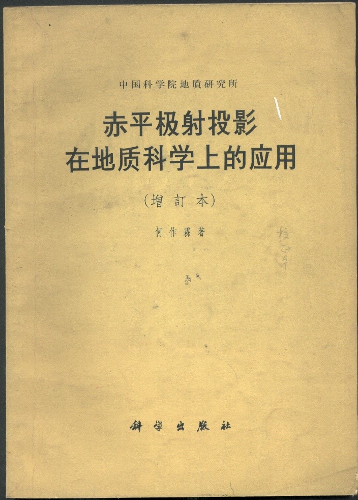“極射赤平投影”不僅是研究巖組學(xué)的重要工具,而且也是地質(zhì)構(gòu)造研究方面的方法典范,在地質(zhì)學(xué)上廣泛應(yīng)用。何作霖是我國第一個(gè)對該方法在地質(zhì)科學(xué)上應(yīng)用做綜合闡述者。他集多年的理論研究、科研實(shí)踐及各國零散資料撰寫出版了《赤平極射投影在地質(zhì)科學(xué)中的應(yīng)用》(科學(xué)出版社,1958)一書,深受巖礦工作者喜歡,后又多次再版。這是世界上第一部這方面的專著,也是中國構(gòu)造地質(zhì)學(xué)和巖石礦物學(xué)工作者長期必讀的重要工具書。