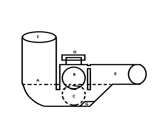 排水管的設(shè)計(如圖):本設(shè)計是在U型管道的基礎(chǔ)上增加固體阻斷機(jī)構(gòu)(球形、圓柱形等多種形體),當(dāng)U型管道中填充一定量的水時,機(jī)構(gòu)內(nèi)的阻斷球就會在浮力的作用下,處于完全開放的狀態(tài),當(dāng)U型管道內(nèi)的水因得不到及時補(bǔ)充而氣化,這時,B球體在重力作用下,隨著管內(nèi)水位下降而下落。在管道底部、球體下落方向增設(shè)斜面,增加球體下落壓力,增加球體密封效果。當(dāng)管道內(nèi)補(bǔ)充一定的水量時,球體的水的浮力作用下,上浮到B區(qū),保持管道通暢。從而達(dá)到有效阻止有害物質(zhì)回流的目的。