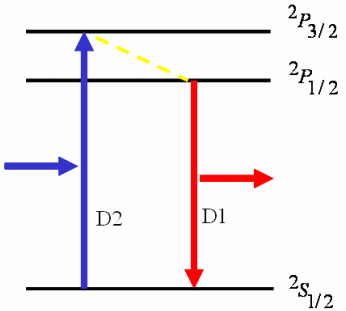 半導體泵浦堿金屬蒸氣激光器(DPAL,Diode Pumped Alkali vapor Laser),是由半導體激光器(LD,Laser Diode)作為泵浦源,堿金屬飽和蒸氣作為激光的增益介質以實現高功率的激光輸出。堿金屬元素包括鋰(Li),鈉(Na),鉀(K),銣(Rb),銫(Cs),它們最外層只有一個價電子,表現出相似的能級結構如圖2-6所示。2S1/2為基態(tài)能級,2P1/2和2P3/2為自旋-軌道相互作用而劈裂的激發(fā)態(tài)能級,其中2P1/2 → 2S1/2躍遷對應D1譜線,稱為激光躍遷;2S1/2 → 2P3/2躍遷對應D2譜線,稱為抽運躍遷,對堿金屬蒸氣進行抽運就是要實現2S1/2和2P1/2能級之間的粒子數反轉。