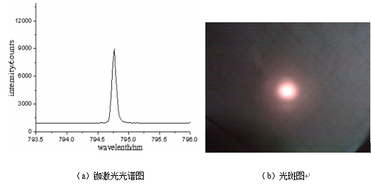 電子所是在國內率先開展DPAL研究工作的單位之一,2012年5月,電子所實現了半導體泵浦線偏振基模銣激光輸出,經繼續(xù)對實驗進行改進,獲得了最高2.8W的銣激光輸出,光光轉換效率達21%。實驗光路如圖2-7所示,實驗測量的銣激光光譜以及光斑如圖2-8所示。