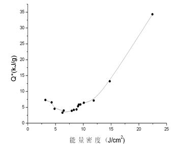 如圖3-5所示,單位面積除漆質量先是隨著能量密度上升,在能量密度為6~8 J/cm2之間達到峰值,隨后下降。當激光能量密度大于12 J/cm2后,單位面積除漆質量顯著下降,此時,激光與樣品表面的作用機理可能已發(fā)生突變。而進一步分析Q*值(Q*=激光能量密度/單位面積除漆質量)隨能量密度的變化曲線,如圖3-6所示。可以看出,當能量密度大于10 J/cm2后,Q*值隨著激光能量密度的提高大幅提高,說明激光能量的利用效率顯著下降。且在入射激光能量密度為6.5 J/cm2時,Q*值為極小值,約為3 kJ/g。
