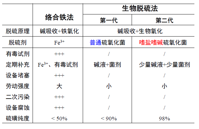 經(jīng)過(guò)中試連續(xù)運(yùn)行我們發(fā)現(xiàn)嗜鹽嗜堿硫氧化脫硫體系相比傳統(tǒng)絡(luò)合鐵法具有明顯的優(yōu)勢(shì):極端微生物可耐受的環(huán)境優(yōu)勢(shì)更為突出,僅需定期補(bǔ)充堿液及少量菌劑就可保證整個(gè)系統(tǒng)連續(xù)運(yùn)轉(zhuǎn),勞動(dòng)強(qiáng)度小,且系統(tǒng)回收單質(zhì)硫磺的純度高達(dá)98%。更多內(nèi)容見(jiàn)下表。