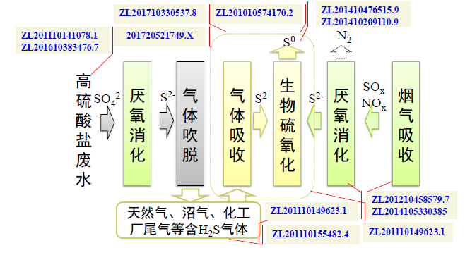 基于嗜鹽嗜堿硫氧化菌開(kāi)發(fā)氣體生物脫硫及硫回收工藝,我們將其在高硫酸鹽廢水和煙氣脫硫脫硝中進(jìn)行應(yīng)用,并對(duì)關(guān)鍵流程的知識(shí)產(chǎn)權(quán)進(jìn)行了全面布局(圖1-8)。