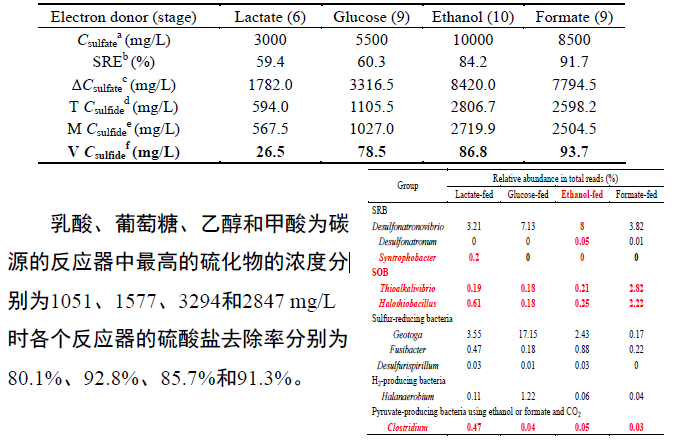 我們將嗜鹽嗜堿脫硫脫氮微生物應(yīng)用到實(shí)驗(yàn)室小試煙氣脫硫系統(tǒng)中,并選擇不同碳源作為電子供體時(shí)其最佳耐受硫化物濃度以及硫酸鹽去除效率(圖1-11)。結(jié)果發(fā)現(xiàn),乙醇為碳源是可耐受的硫化物濃度可高達(dá)3000 mg/L以上,硫酸鹽的去除率在90%左右。更多內(nèi)容見(jiàn)下表。