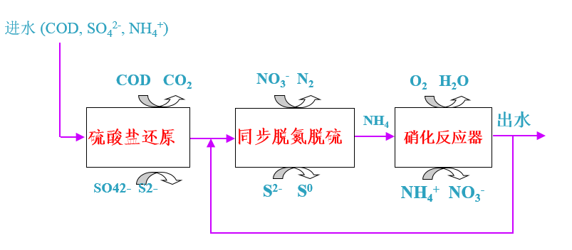 在通常條件下含硫工業(yè)廢水中同時(shí)含有大量的氮素,高含硫含氮也是制藥生產(chǎn)廢水的另一主要特征。隨著生物脫硫技術(shù)與生物脫氮技術(shù)的發(fā)展,通過(guò)研究碳氮硫共代謝體系,硫酸鹽的還原產(chǎn)物的生物氧化過(guò)程與含氮污染物反硝化過(guò)程,相互間的作用關(guān)系,提出了碳氮硫共脫除體系。