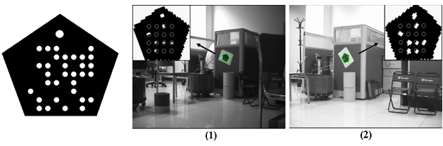 圖6 面向機(jī)器人視覺系統(tǒng)的MR-二維碼,左圖是MR-二維碼,右圖(1)和(2)是MR-二維碼在不同光照下的識(shí)別效果