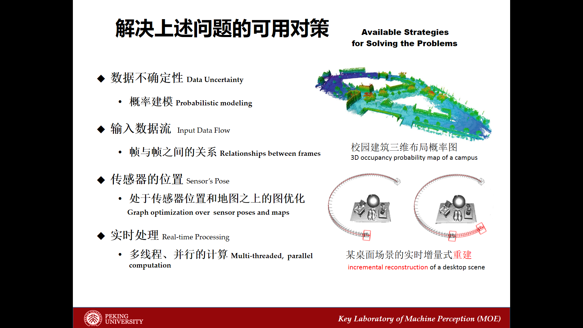 這里有一些對(duì)策,我給各位介紹一下相關(guān)的研究。我前面講的第一個(gè)問題,就是數(shù)據(jù)的不確定性的處理。我們做定位也好,做建模也好,要有一個(gè)通用的空間的描述,這個(gè)描述有了以后能夠把這些做好??臻g的描述就是方位構(gòu)圖,有各種各樣的描述方式。以前講的描述方式是“零、一”關(guān)系,里面有物體就是一,沒物體就是零。但是現(xiàn)在描述空間可能不是“零、一”的關(guān)系,對(duì)空間只能有一個(gè)概率的描述。應(yīng)該把這個(gè)場景的面的存在的概率是多少先計(jì)算出來,用一些推理。如何用更復(fù)雜的非參數(shù)的推理來做,有一系列問題在里面。能不能把三維空間看成格子狀的結(jié)構(gòu),這里面的每一個(gè)點(diǎn)它到底在不在這個(gè)面上,它有一定的概率,把這個(gè)概率數(shù)據(jù)收集進(jìn)來以后,數(shù)據(jù)對(duì)概率產(chǎn)生了改變,我可以更有把握地說有這個(gè)表面。通過我進(jìn)來的每一個(gè)采樣點(diǎn)對(duì)這個(gè)空間的概率分布做修正。這是這篇文章所做的工作。我們實(shí)驗(yàn)室有些學(xué)生對(duì)這方面做了更好的改進(jìn),現(xiàn)在投到了ECCV這個(gè)國際會(huì)議上,把空間的表示用概率的描述表示了。