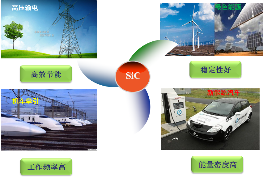 以碳化硅(SiC)為代表的寬禁帶半導體大功率器件是目前在電力電子領域發(fā)展最快的新型半導體功率器件。碳化硅器件在高壓直流輸電,以及綠色能源,機車牽引高鐵,新能源汽車方面有很好的應用潛力。應用于高壓直流輸電領域,具有高效節(jié)能的特點。在綠色能源方面,碳化硅本身的可靠性和穩(wěn)定性比較好,適合在苛刻的環(huán)境里面使用。在機車牽引領域,用碳化硅MOSFET取代硅IGBT,可提高工作頻率。碳化硅也非常適合應用于電動汽車以及混動汽車,因為用它做出來的PCU的體積小,效率高,可提高電動汽車的能量利用效率。