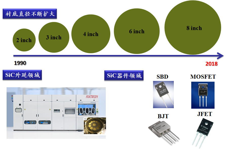 碳化硅材料的發(fā)展是非常迅速的,從1990年開始,2英寸的碳化硅出現之后,到2015年8英寸的碳化硅也已經出現了,但是8英寸的碳化硅材料質量還不夠成熟,現在最成熟的是4英寸和6英寸的。現在量產的情況是4英寸晶片在往6英寸轉,有一些國外的企業(yè)已經大規(guī)模使用6英寸碳化硅了,目前國內有很多6英寸硅的生產廠,把硅的設備改成碳化硅的設備,再添加一些碳化硅專用設備,就可以進行6英寸碳化硅的流片。