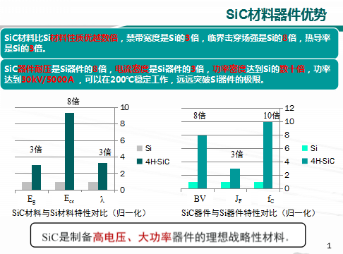 在電力裝備中電力電子器件是最重要的部分之一,但是,目前電網輸送電壓500kV、800kV甚至達到1100kV,最基本的電力電子器件,Si器件,已經達到了由Si材料性能確定的極限,難以滿足智能電網的要求,更高電壓、更大容量、更高效率、更高結溫,亟需新型戰(zhàn)略性的材料器件體系。SiC材料的禁帶寬度是Si的3倍,臨界擊穿場強8倍,熱導率是3倍,材料性能優(yōu)勢明顯。SiC器件的耐壓是Si器件的10倍,電流密度3倍,頻率是Si的10倍,是制備高電壓、大功率器件的新型戰(zhàn)略性材料。