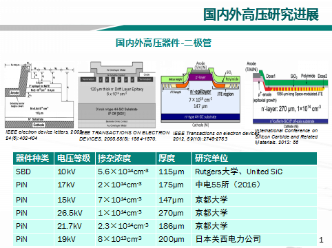 雖然在低壓領域SiC已經進入產業(yè)。但是在高壓領域,不管是國內還是國外都還處于研發(fā)階段。由于材料的優(yōu)勢,國外的研發(fā)進度要領先一些,日本京都大學在3年前就研發(fā)了26.5kV的PiN二極管,美國的Cree公司在也在3年前就研發(fā)了20.7kV的IGBT。國內在引進先進的厚膜外延設備后,厚膜外延材料制備技術得到進步,最近也在高壓器件方面做了一些成績,比如中電55所在2016年報道了17kV 的PiN二極管,在2018年報道了12kV 的IGBT,說明國內材料在一步步進度,器件的差距也和國外漸漸縮小。