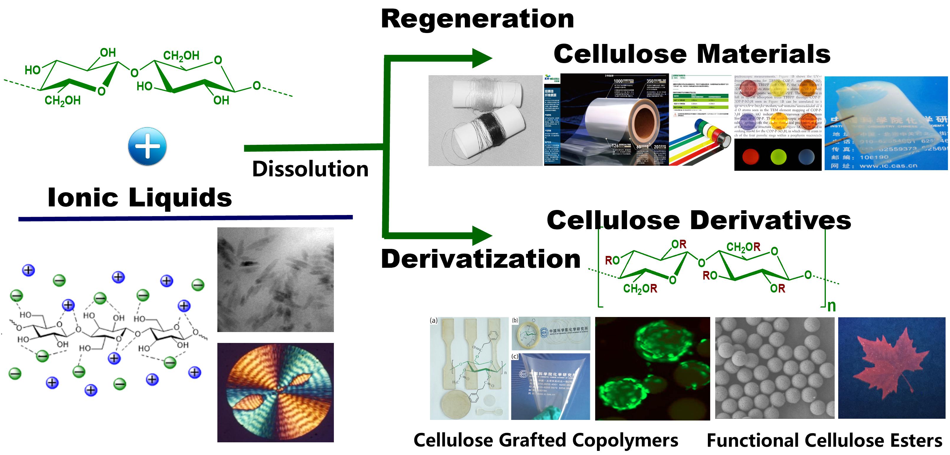 纖維素的高效溶劑是纖維素學科里面長期研究的一個熱點。過去五十年人們一直在做溶劑的開發(fā),但大部分溶劑的溶解能力有限,或者溶劑本身不穩(wěn)定,也很貴。我們做的是最新一代的溶劑-離子液體,它是典型的陰陽離子結構,主要是有機陽離子結合各種陰離子。它的主要優(yōu)點是不揮發(fā)、不燃燒,是綠色化學里邊三大綠色溶劑(離子液體、二氧化碳、水)里邊一個典型的代表。