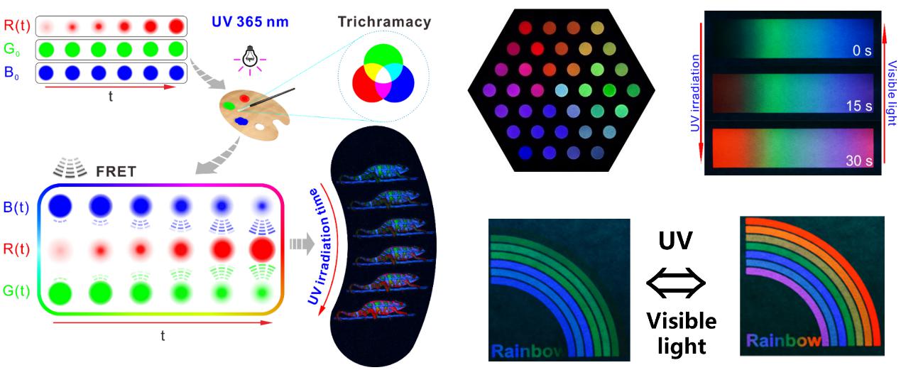 比如發(fā)光的防偽材料,利用纖維素均相可控反應的優(yōu)勢,把原來容易聚在一起的熒光分子,通過化學方法鍵合到纖維素上,克服了溶液狀態(tài)下聚集誘導淬滅效應,將其制成固態(tài)熒光材料,同時它仍然具有高分子的可打印、可噴涂的特點,將不同的發(fā)光基團接到不同的纖維素上可以得到不同的顏色,將紅、綠和藍三種顏色的纖維素衍生物共混,利用三基色原理,還可以做打印的動態(tài)熒光材料(圖5)。