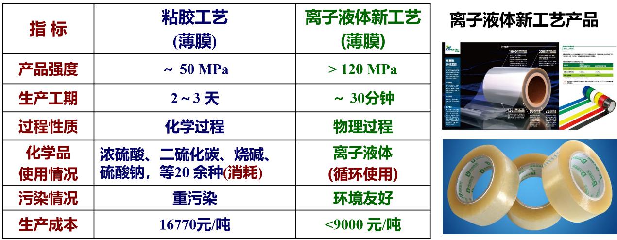 以前纖維素制膜工藝污染很大,中國逐漸在關停。而我們的離子液體工藝是物理溶解,基本沒有污染。原來工藝需要三天時間,現(xiàn)在三十分鐘就做出來了(圖8)。在車間里面都聞不到氣味,火都點不著,非常安全。其中溶劑是我們的專利,包括后面的溶劑回收,溶劑是可以回收再反復利用的。用我們這個工藝與企業(yè)合作建立了生產線,2019年基本已經建成了,今年11月底試車。生產的產品推薦在快遞物流上使用,特別是用低成本秸稈做的膠帶,有很好的應用前景。